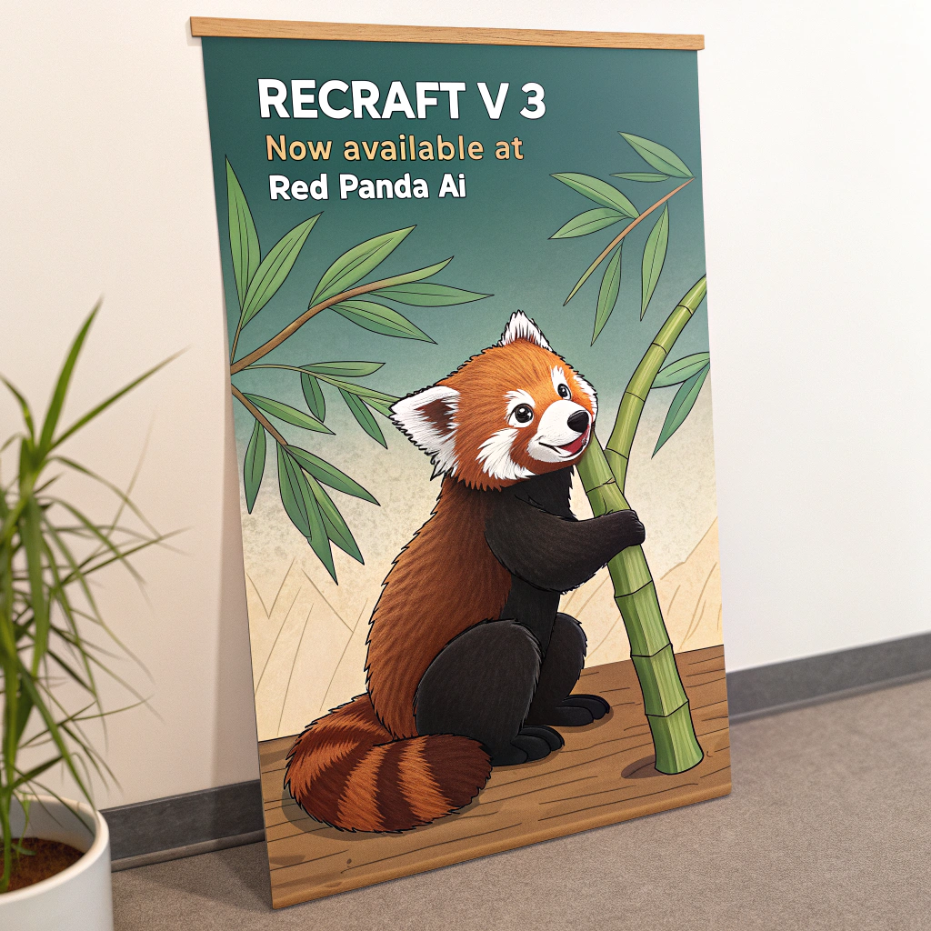 a red panda eating a bamboo in front of a poster that says "recraft V3 now available at red panda ai